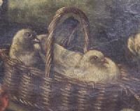 Nel cesto di vimini, sono collocate le due bianche colombe in contrastano con lo sfondo scuro del paesaggio, questa scelta come base partenza, di un’intensità scura, è per meglio mettere in risalto i frutti e gli animali.