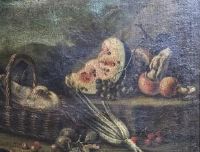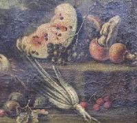 Ritroviamo in quest’opera una particolare ricercatezza nel dipingere gli animali dal vero, vedi il tacchino e le due colombe nel cesto (foto a), e nel descrivere la polpa dei frutti, vedi il cocomero (foto c).
