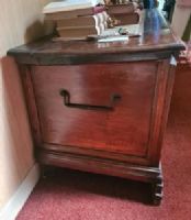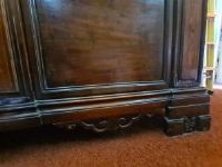 Eseguita in noce massello con intarsi in acero. Fronte in due pannelli incorniciati, scompartiti da lesene intarsiate e incorniciate. Appoggi a capitello rovesciato. Sotto il cornicione, eseguito a linee spezzate, due fregi a forma di parentesi graffe. Sui fianchi sono presenti due robuste maniglie in ferro battuto. Il piano è provvisto di becco di civetta e cornicione scolpito sottopiano.Ottimo stato di conservazione, con leggera imbarcatura del piano.
