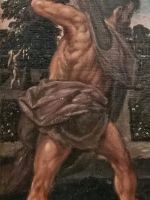 "Hercules slaying the Hydra" Emilian school, 17th century. Oil painting on canvas, with some restoration retouching. Canvas dimensions: 64x56 cm with a beautiful gilded wooden frame with gold leaf: 87x79 cm.